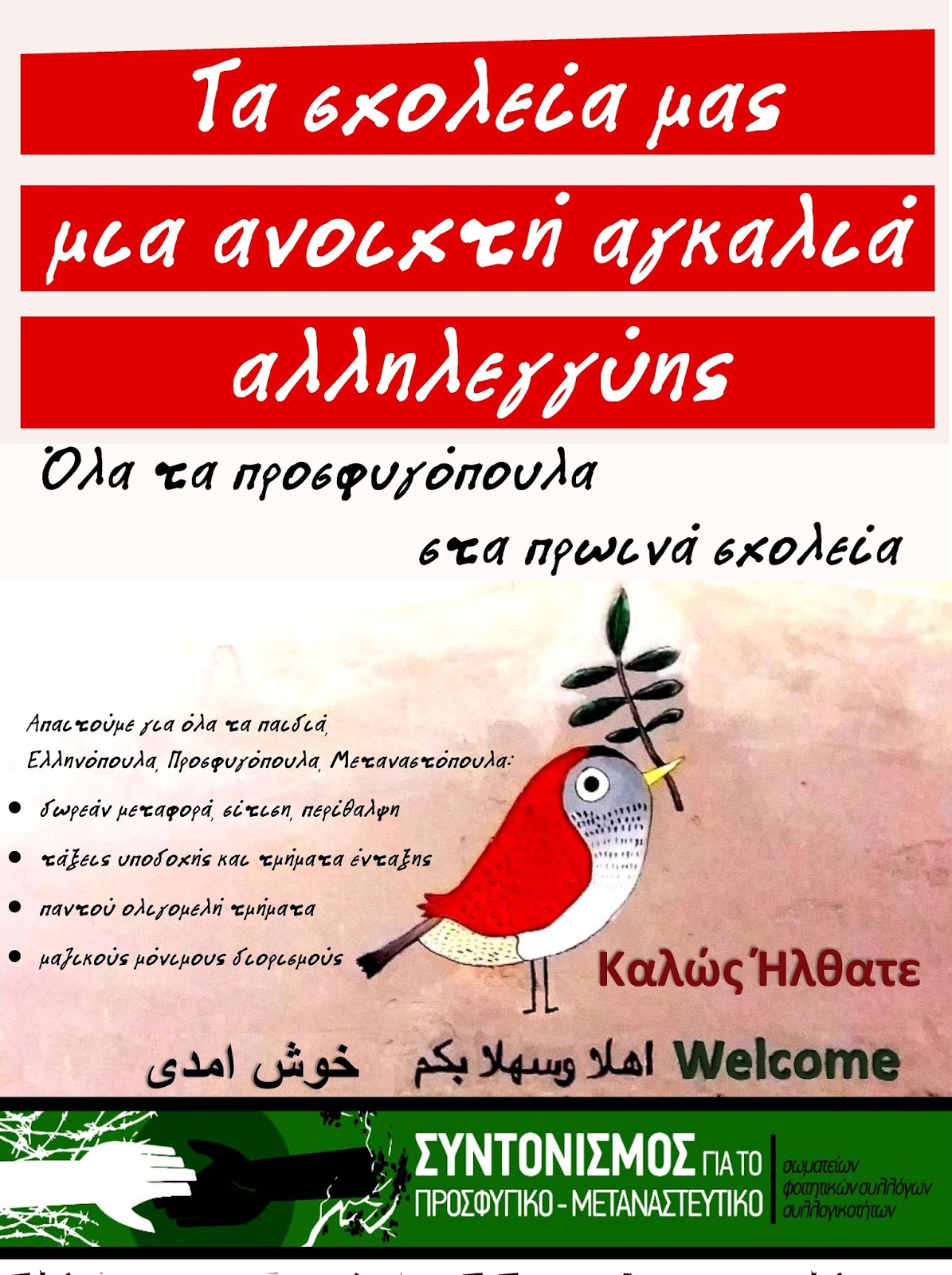 Καλούμε σωματεία, συλλογικότητες γειτονιάς, φοιτητικούς συλλόγους, αντιρατσιστικές, μεταναστευτικές, αντιφασιστικές πρωτοβουλίες και συντονισμούς ώστε να δράσουμε από κοινού για να ανοίξουν τα πρωινά σχολεία στα προσφυγόπουλα και τα μεταναστόπουλα όπου κι αν κατοικούν με όλες τις απαραίτητες υποστηρικτικές δομές, μικρά τμήματα, τμήματα υποδοχής, πούλμαν για να μετακινηθούν κ.λπ. Σημειώνουμε ότι η πρώτη προθεσμία για τις εγγραφές στα Δημοτικά και Νηπιαγωγεία της χώρας είναι στις 19/5